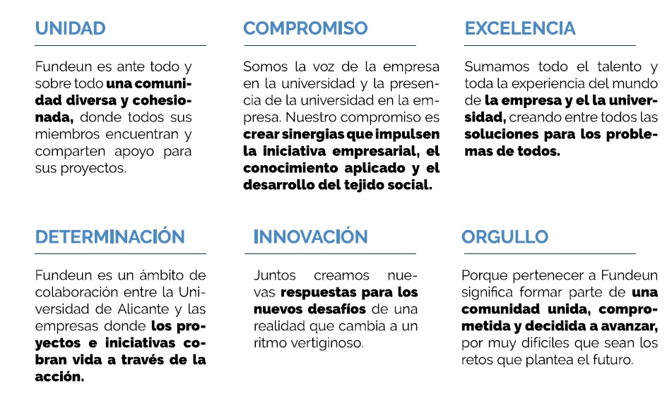 Nuestros VALORES marcan el saber-hacer del Patronato y equipo de FUNDEUN con un funcionamiento ágil, profesional e independiente: